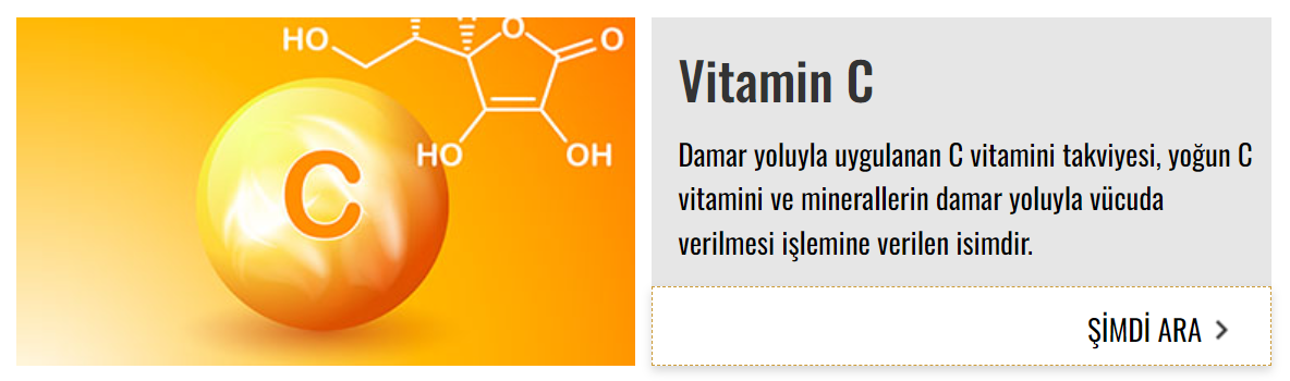 Bağışıklık güçlendirme ve yaşlanma karşıtı etkisiyle de bilinen damar yoluyla vitamin takviyesi, son dönemde sürekli uygulanan bir destek tedavi yöntemi haline gelmiştir. Damar yoluyla yüksek doz C vitamini tedavisi, uzman hekimler tarafından yapılır. Hem virüslere karşı etkisinin olduğu düşünülmesi hem de yorgun düşmüş kişilerin hızlı toparlanmasını sağlaması nedeniyle C vitamini sıklıkla hastalarımız tarafından talep edilmektedir.